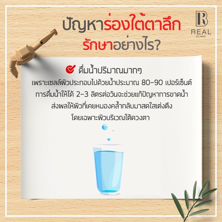 เพราะเซลล์ผิวประกอบไปด้วยน้ำประมาณ 80-90 เปอร์เซ็นต์เลยค่ะ การดื่มน้ำให้ได้ 2-3 ลิตรต่อวันจะช่วยแก้ปัญหาการขาดดน้ำได้ ส่งผลให้ผิวที่เคยหมองคล้ำกลับมาสดใสเต่งตึง โดยเฉพาะผิวบริเวณใต้ดวงตา