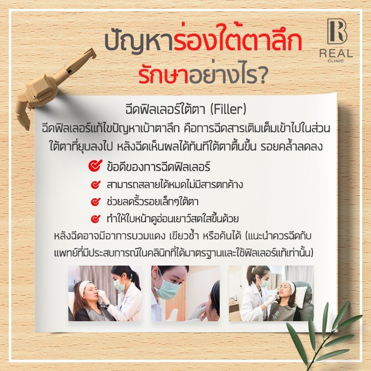 การฉีดฟิลเลอร์ แก้ไขปัญหาเบ้าตาลึก คือการฉีดสารเติมเต็มเข้าในส่วนใต้ตาที่ยุบลงไป หลังฉีดเห็นผลได้ทันที ใต้ตาตื้นขึ้น รอยคล้ำใต้ตาคล้ำลดลง