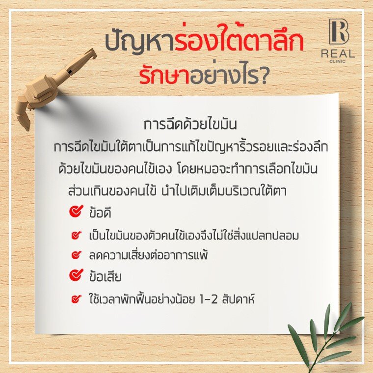 การฉีดไขมันใต้ตาเป็นการแก้ไขปัญหาริ้วรอยและร่องลึก ด้วยไขมันของคนไข้เอง โดยหมอจะทำการเลือกไขมันส่วนเกินของคนไข้ นำไปเติมเต็มบริเวณใต้ตา