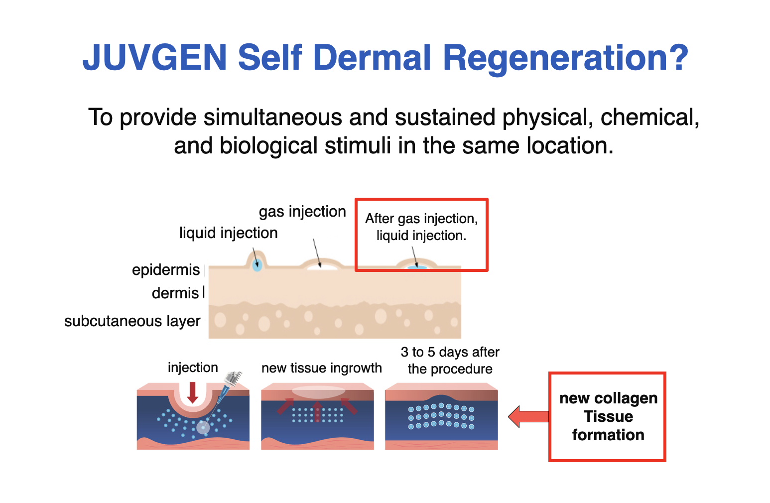 จูวีเจน (Program Real Juvgen) เป็นเทคนิคการรักษาหลุมสิวที่อาศัยกลไกสามประการ ได้แก่ ทางเคมี (chemical) ทางชีวภาพ (biological) และทางกายภาพ (physical) โดยใช้สารประกอบหลักคือ ก๊าซคาร์บอนไดออกไซด์ (CO2) และกรดไฮยาลูโรนิก (HA)อนุภาคเล็ก การทำงานของเทคนิคนี้เริ่มจากการฉีดสารละลายเข้าสู่ชั้นหนังแท้ใต้หลุมสิว ซึ่งเป็นบริเวณที่เนื้อเยื่อผิวถูกทำลายและยุบตัวลง ก๊าซคาร์บอนไดออกไซด์จะช่วยเติมเต็มช่องว่างของหลุมสิวในทันที พร้อมๆกับที่กรดไฮยาลูโรนิก (HA) อนุภาคเล็ก ช่วยเพิ่มความชุ่มชื้นและกระตุ้นการสร้างคอลลาเจนปริมาณมาก นอกจากนี้กระบวนการฉีดสารละลายยังทำหน้าที่เสมือนการตัดพังผืดอย่างอ่อนโยน ช่วยให้เกิดการสร้างเนื้อเยื่อใหม่ขึ้นมาทดแทน