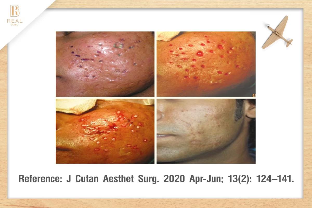 โปรแกรม REAL Acne Scar Synergy ก็มีการรักษาด้วยเทคนิคเดียวกันกับที่เกาหลีนี้รวมอยู่ในหัตถการหลักด้วย แต่จะแตกต่างตรงตัวยาที่ฉีดเข้าไป(ของทางเกาหลีจะมีเฉพาะกรดไฮยาลูโรนิคอย่างเดียว หรือบางคลินิกจะเป็นสาร PDRN เท่านั้น) สูตรตัวยาแบบเฉพาะของหมอที่ฉีดเข้าไปแล้วทำให้เกิด Skin Regenerationร่วมกับการฉีดก๊าซคาร์บอนไดออกไซด์นั้นเป็นการรวบรวมตัวยาที่มีงานวิจัยรับรองแล้วว่ากระตุ้นและเพิ่มคอลลาเจนใต้ผิวได้จริง ได้แก่ ไฮยาลูโรนิคแอซิด โพลีนิวคลิโอไทด์ เอกซ์โซโซม โกรทแฟคเตอร์และวิตามินสารอาหารผิวต่างๆ ที่ช่วยบำรุงผิวด้วยอีกทั้งยังมีหัตถการอื่นๆทำควบคู่กันไปด้วย ไม่ว่าจะเป็นการผ่าตัดพังผืด SurgicalSubcision ด้วยเครื่องมือพิเศษเฉพาะแต่ละหลุม, Chemical Reconstruction TCA CROSS/PAINT, Collagen Induction Therapy เพื่อให้ครอบคลุมปัญหาหลุมสิวที่คนไข้เป็นได้มากที่สุดค่ะ