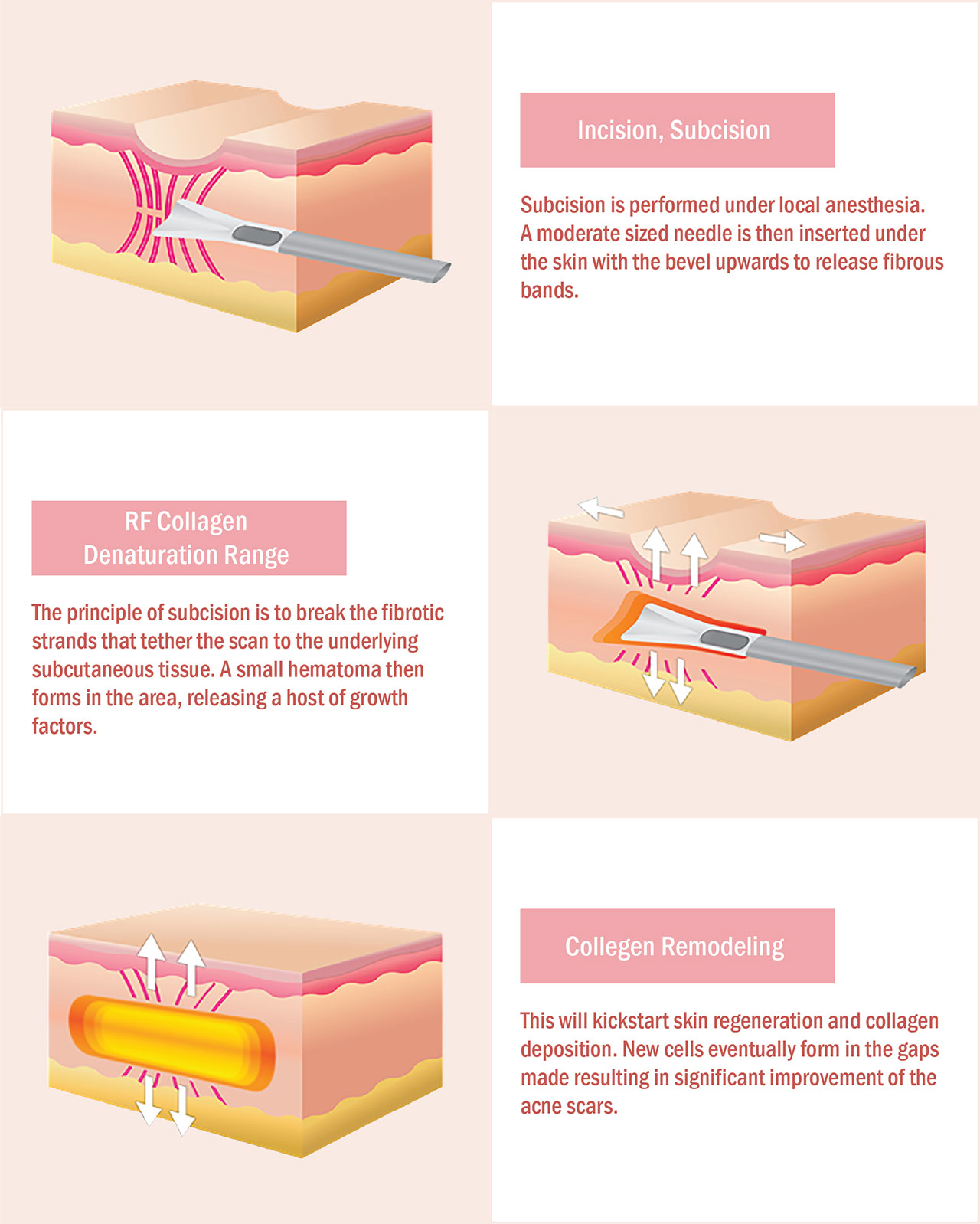 A : พื้นฐานของโปรแกรมการรักษานี้ จะทำให้เกิดการตัดพังผืด และมีการสร้างคอลลาเจนฟื้นฟูเนื้อเยื่อผิวขึ้นมาใหม่ หากมองแค่ในหลักการนี้ก็จะถือว่าเป็นวิธีที่ให้ผลลัพธ์ที่ถาวรทำนองเดียวกันกับการทำเลเซอร์เพื่อกระตุ้นคอลลาเจนขึ้นมาเติมหลุมสิวแต่หากมองในแง่ของการมี Aging process มาเกี่ยวข้องตามธรรมชาติของมนุษย์ร่วมด้วยแล้วคอลลาเจนที่ผิวสร้างขึ้นเองนี้จะมีการลดลงครึ่งหนึ่งของที่มีอยู่(half-life) ในทุกๆประมาณ 15 ปีร่วมกับการสูญเสียปริมาตรของโครงสร้างที่พยุงใบหน้าทั้งชั้นเนื้อเยื่อไขมันและชั้นกระดูกเมื่อเวลาผ่านไป หากมองในแง่นี้ด้วยก็ควรจะถือว่าเป็นผลลัพธ์แบบกึ่งถาวร เพราะเมื่อทุกชั้นผิวหนังโดยรวมเกิดความเสื่อมสภาพลงตามวัย